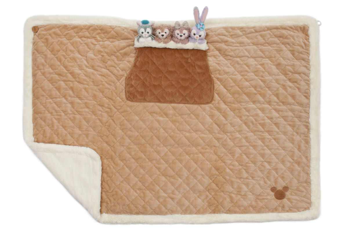 ダッフィー、シェリーメイ、ジェラトーニ、ステラ・ルーのマスコットがついたブランケット。