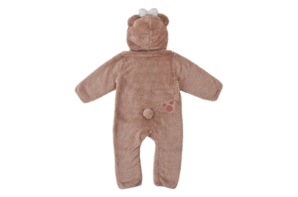 腰にはコロンとしたしっぽ、しっぽ横にはミッキーモチーフ、肘にはダッフィーモチーフがデザインされています。
