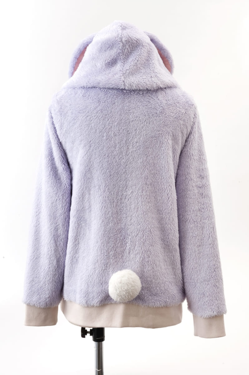 女の子らしいラベンダー色に、フードには裏面にミッキーモチーフがあしらわれた長い耳やブルーのお花付き!
