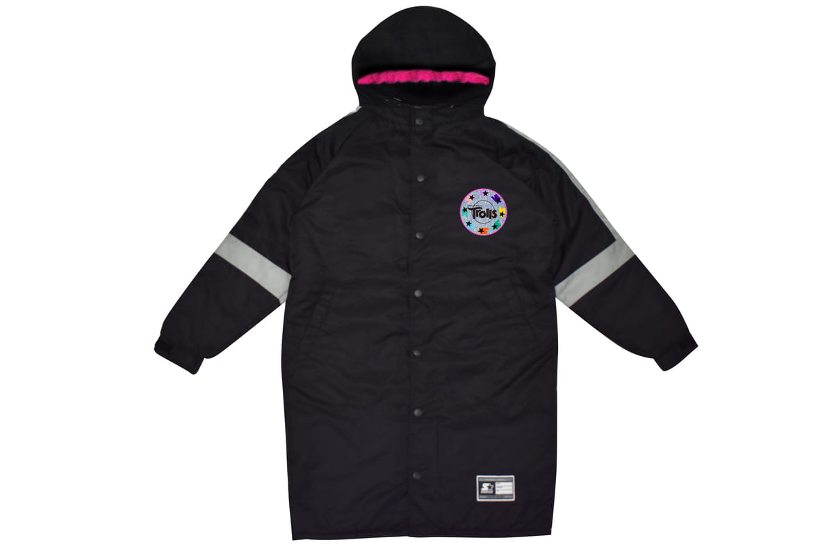 左胸部に『トロールズ』のグリッターワッペンがあしらわれた「スターター x トロールズ コラボベンチコート」
