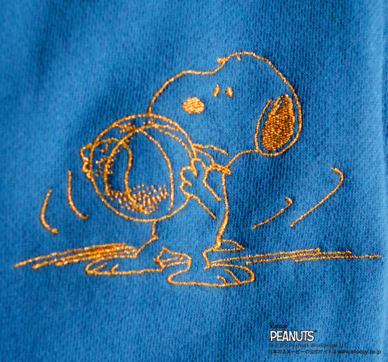 カラフルな色使いでちりばめられたスポーツに興じる「スヌーピー」は、刺繍で表現されているので子供っぽくなりすぎません。