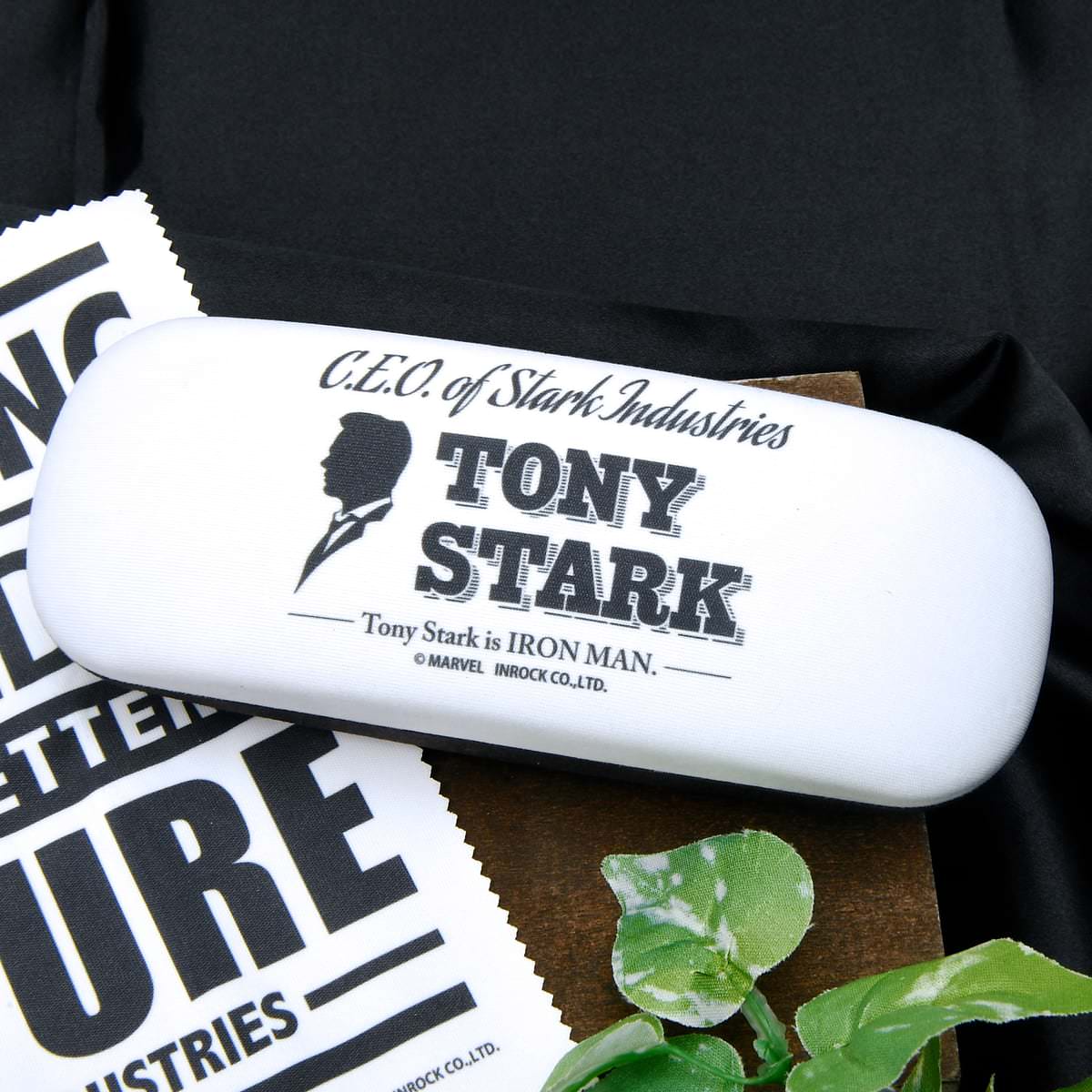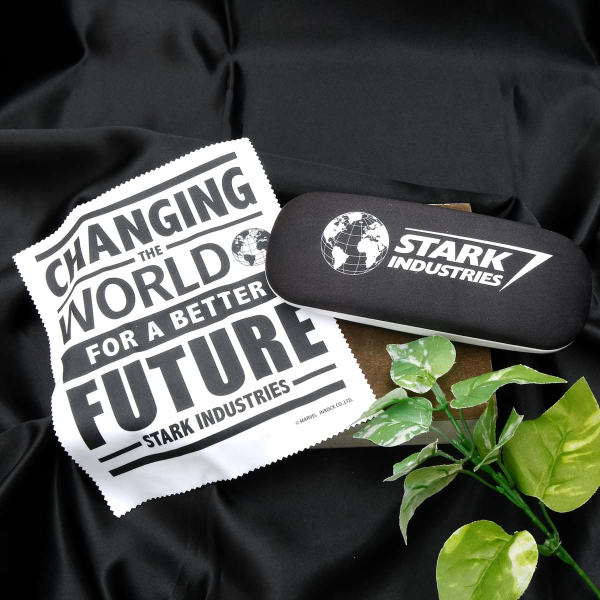 付属されるメガネクロスには「スターク・インダストリーズ」の社訓「CHANGING THE WORLD FOR A BETTER FUTURE(よりよい未来のために世界を変える)」の英字入り。