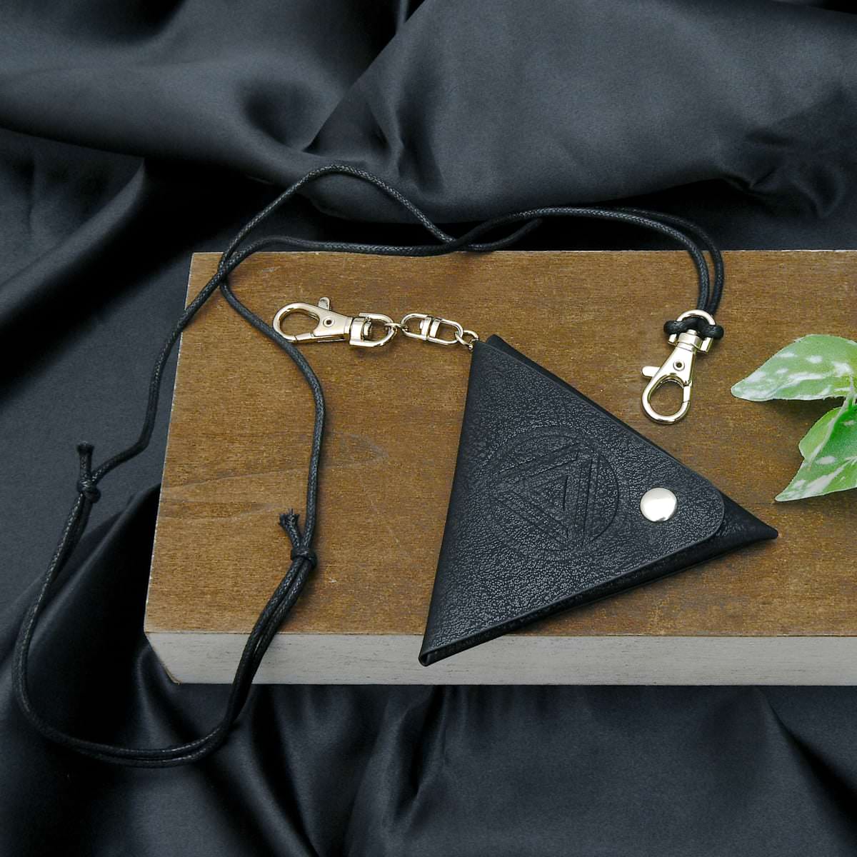 シックなブラックカラーでまとめられた「三角コインケース」