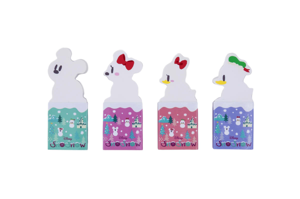 「スノーミッキー」と「スノーミニー」「スノードナルド」「スノーデイジー」のケシゴムがセットでラインナップ。