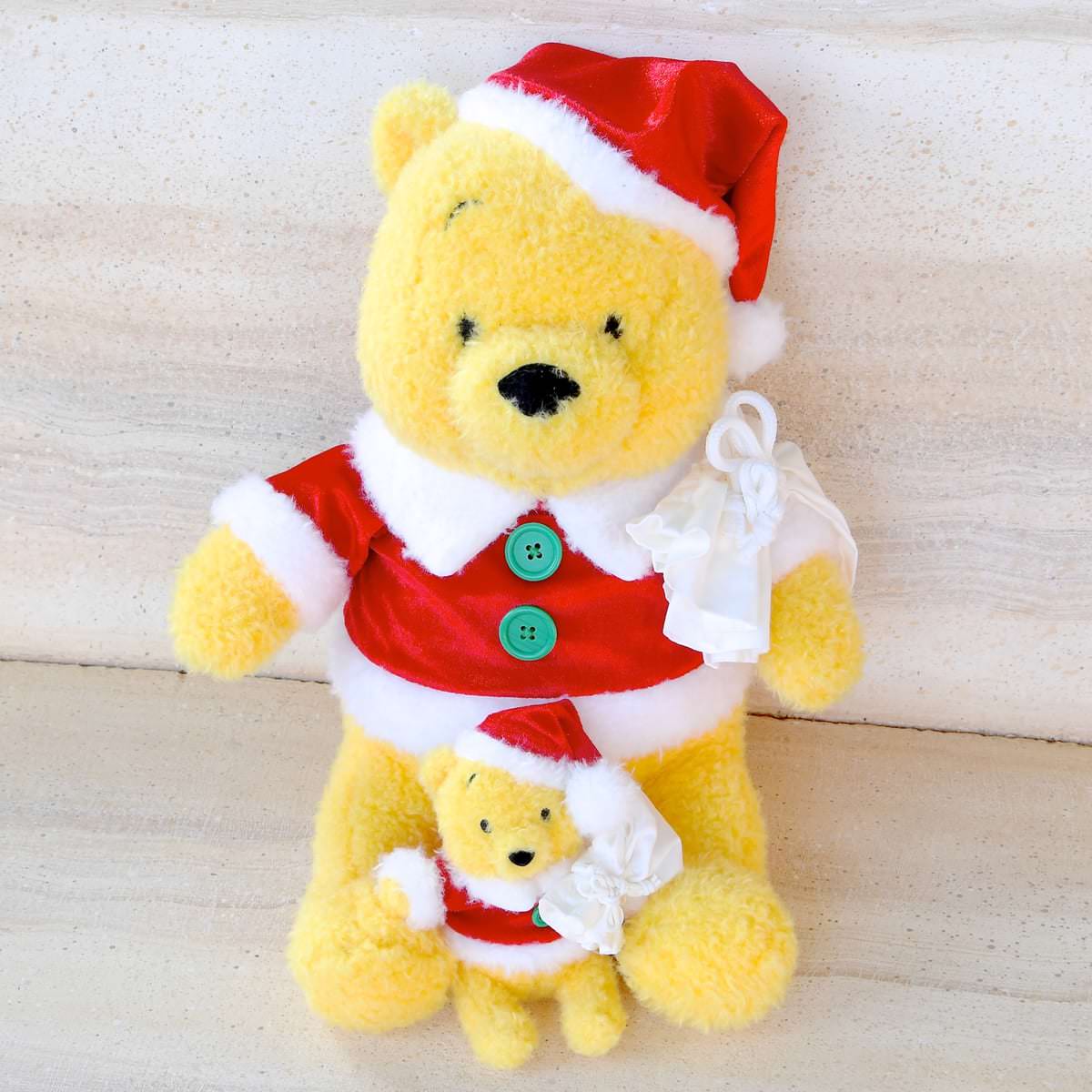 サンタコスチュームのかわいいくまのプーさんぬいぐるみとぬいぐるみバッジを紹介します☆