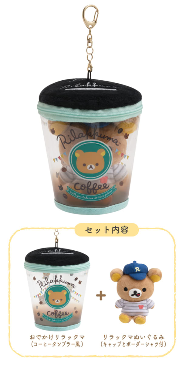 コーヒーショップのタンブラー風のケース「おでかけリラックマ」とキャップがおしゃれな「リラックマぬいぐるみ」がセットになっています。