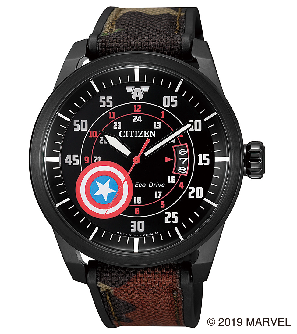 『キャプテン・アメリカ』を象徴する盾がアイコン・モチーフとして文字板に配されたモデル。