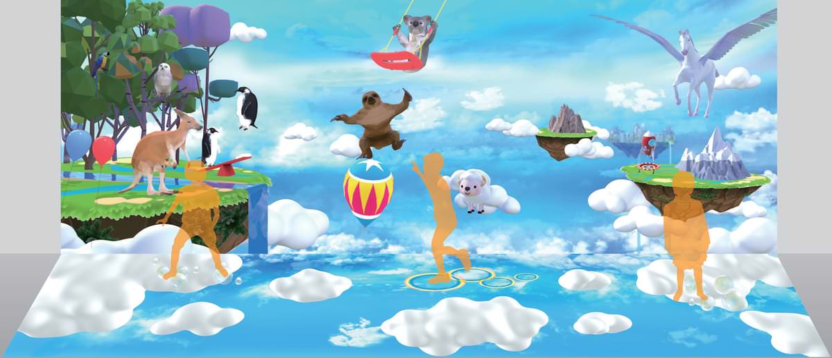 床面に足を踏み入れると、足元には美しいレインボーサークルが広がり、空には風船やシャボン玉がふわりと浮かびます。