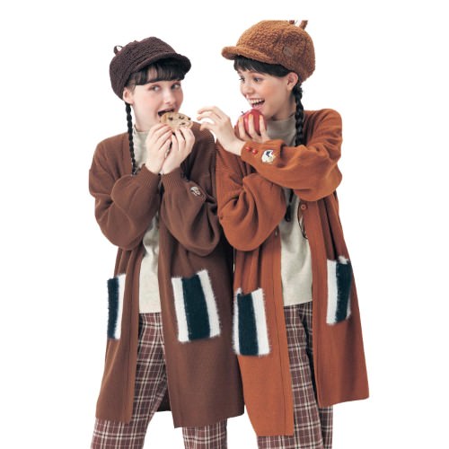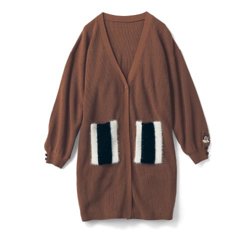 明るめのブラウンにポケットの縞模様が映える「デール」デザインのロングカーディガン。