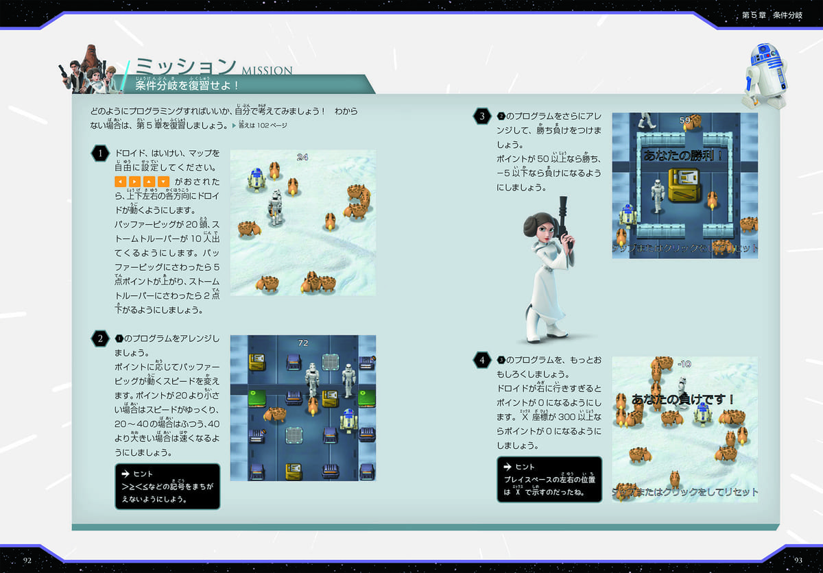 「スター・ウォーズ」のキャラクターが出すミッションをプログラミングで解決していく構成になっています。