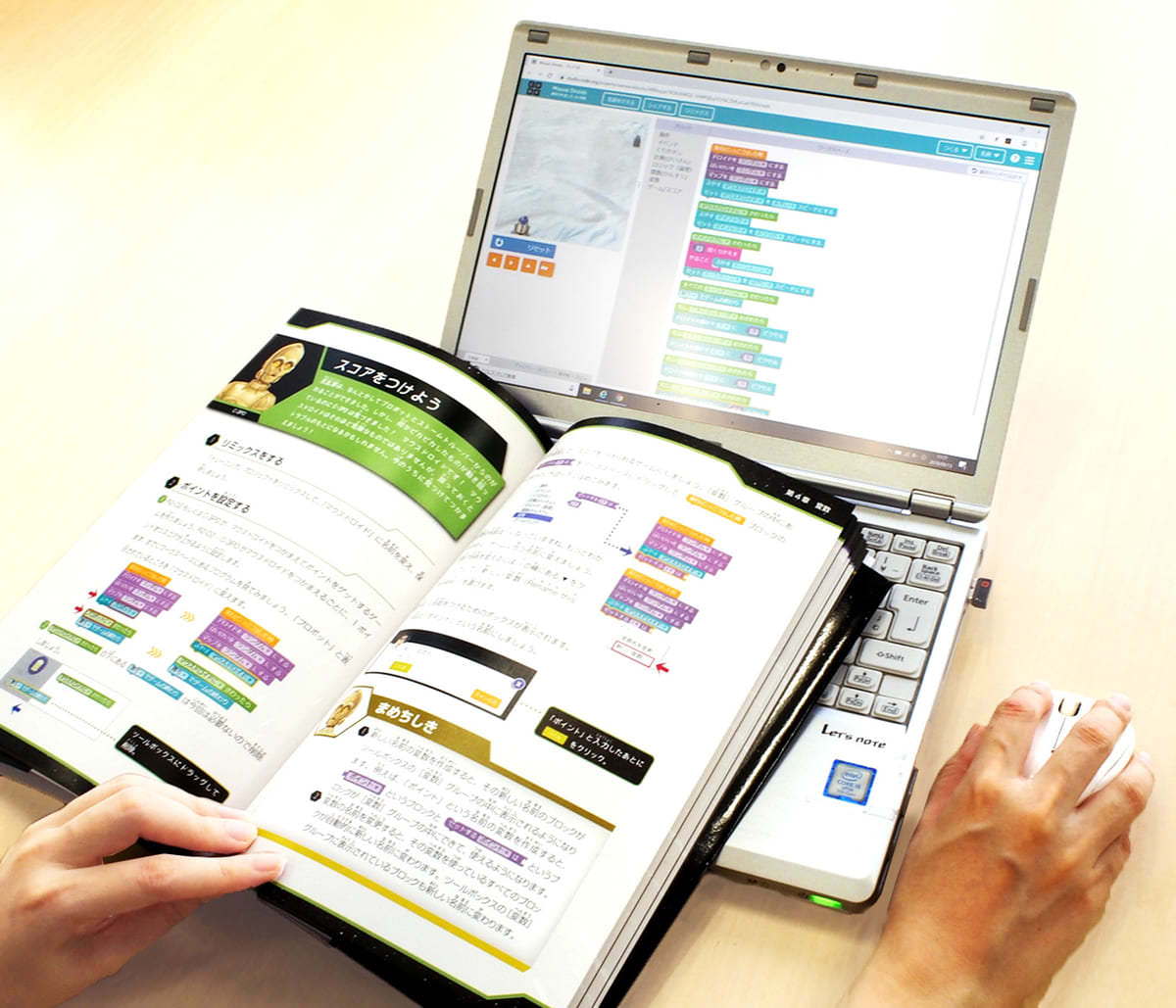 「スター・ウォーズ」キャラクターが登場する本を読んでプログラミングの考え方を学びながら、ウェブサイト上で実際に操作をしてゲームを作ることで、ものづくりの楽しさを味わいつつプログラミングに慣れることができます。