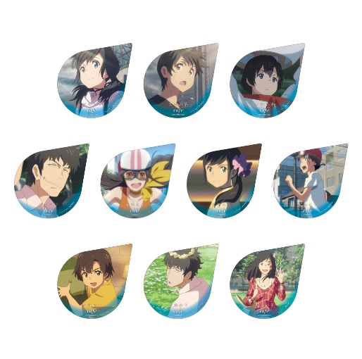 雨つぶ型のステッカーに「森嶋帆高」や「天野陽菜」「須賀圭介」などがプリントされています。