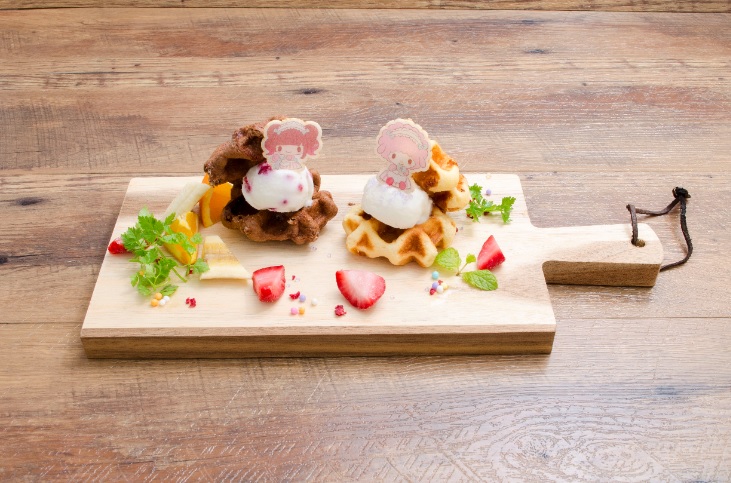 チョコ味とプレーン味のベルギーワッフルの上にはすわわとピアノが座っています。