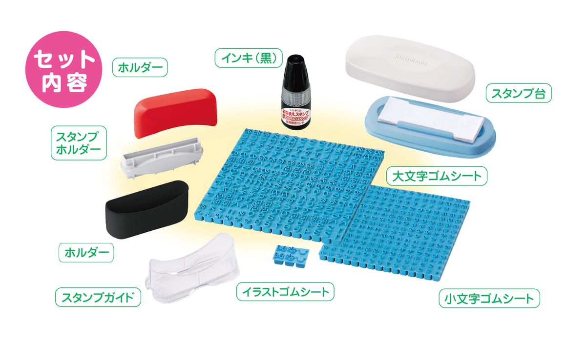 ホルダーが2つ、スタンプホルダー、スタンプガイド、イラストゴムシート、大文字ゴムシート、小文字ゴムシート、スタンプ台、インキ(黒)がセットになっています。