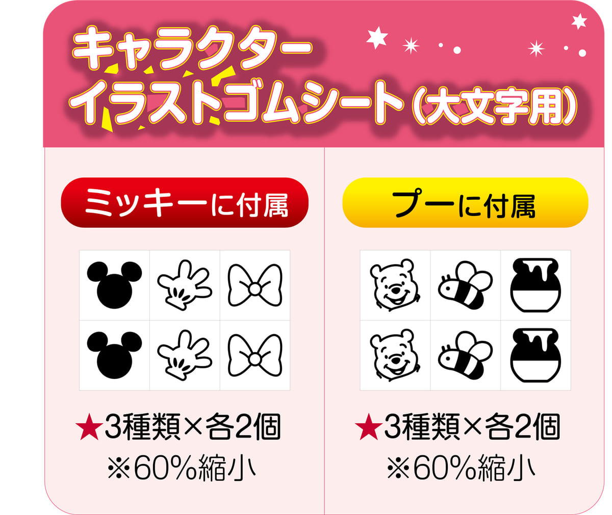 大文字・小文字ゴムシートに加え、名前と一緒にかわいらしいキャラクターのイラストが捺せる、キャラクターゴムシートが付属されています。