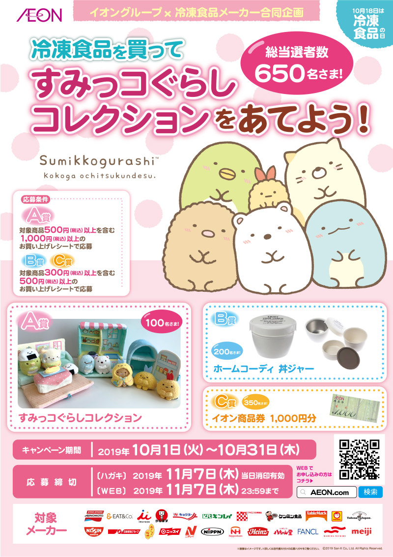 イオングループ×冷凍食品メーカー合同企画「冷凍食品を買って、すみっコぐらしコレクションをあてよう!キャンペーン」は、2019年10月1日(火)から10月31日(木)まで、イオングループ対象店舗にて実施中です。