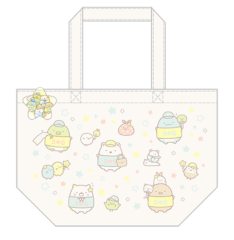 「すみっコ」たちのかわいいトートバッグに「すみっコ」たち全員が集合した缶バッジが付いています。