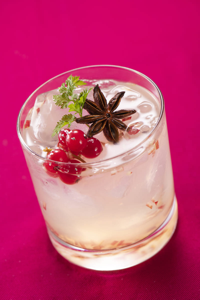 アップルジュース、ストロベリーシロップ、 フランボワーズシロップ、セブンアップ、 リンゴ、ローズマリー、スライスレモンが入ったスペシャルドリンク。
