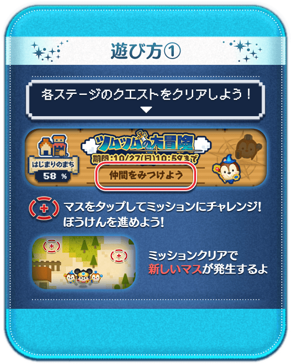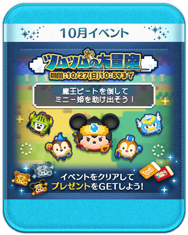 「LINE:ディズニー ツムツム」にて期間限定で実施される新イベント「ツムツムの大冒険」は、2019年10月3日(木)から10月27日(日)までの期間限定で開催です☆