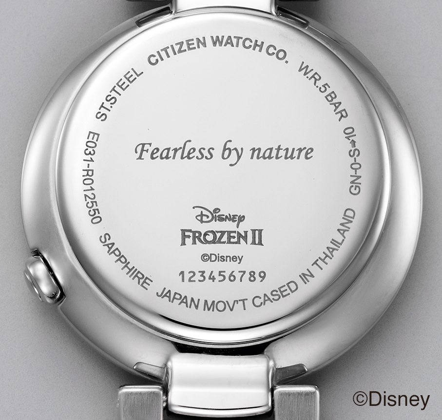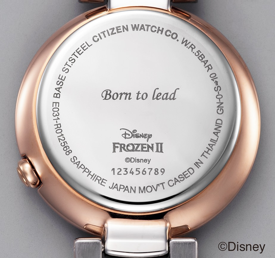 「エルサ」と「アナ」それぞれのイメージが文字板やバンドのカラーリングで表現され、裏ぶたにはそれぞれのキャラクターを表現した言葉が刻印されています。