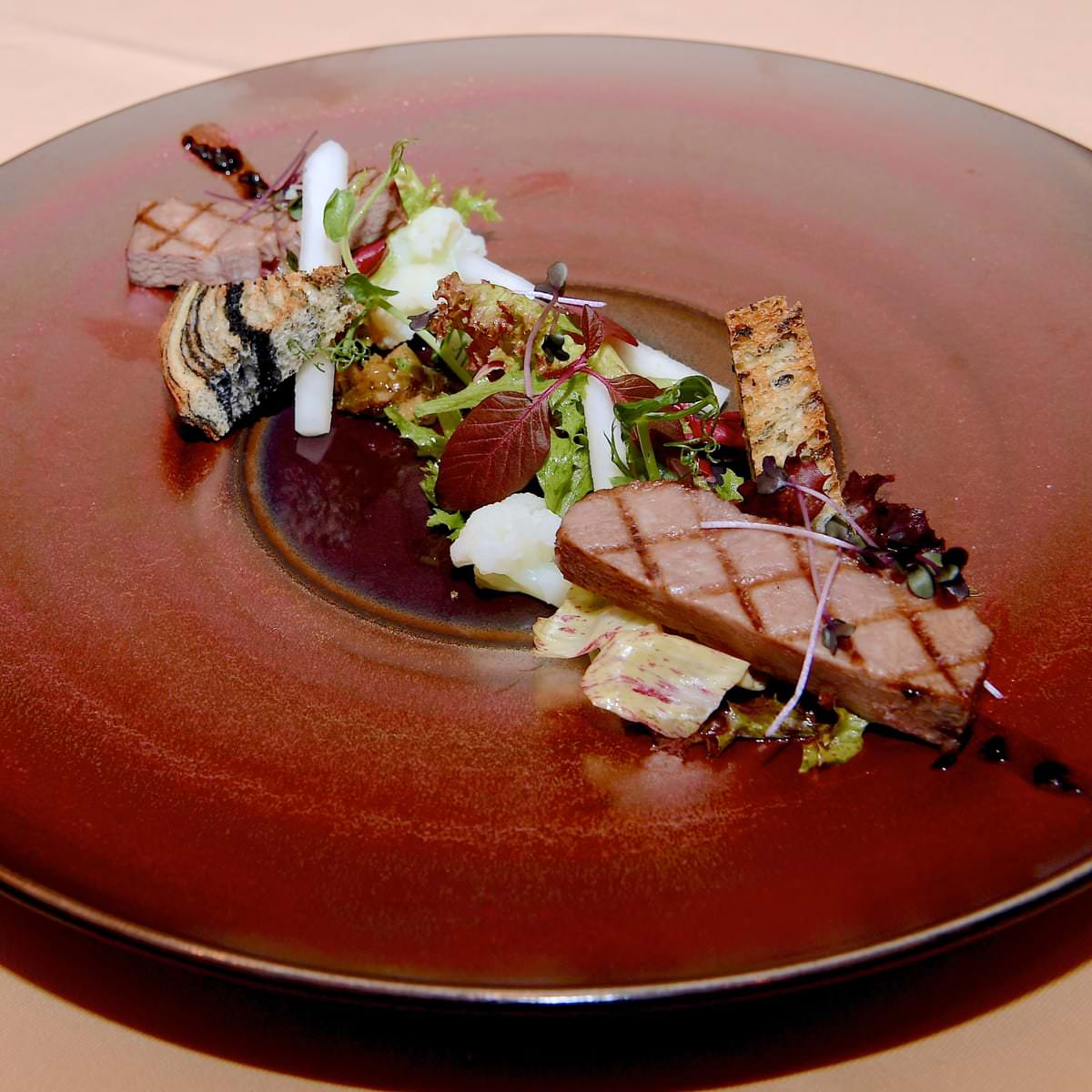 - 牛タンのグリルコンフィと白レバーペースト 竹炭ブリオッシュと林檎のサラダ (写真右)