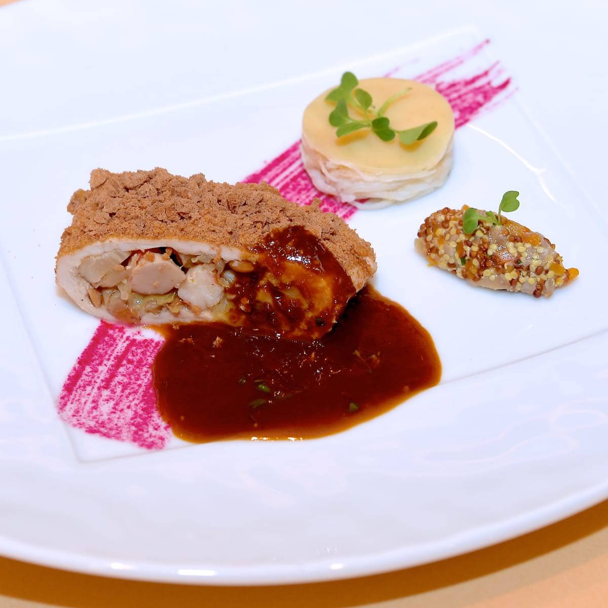 パンデピスを纏ったホロホロ鶏胸肉のファルス包み 焦がしマスタード香るシェリーヴィネガーソース