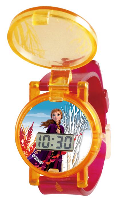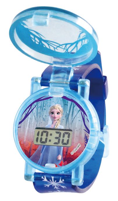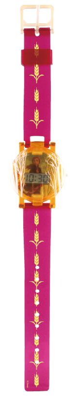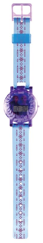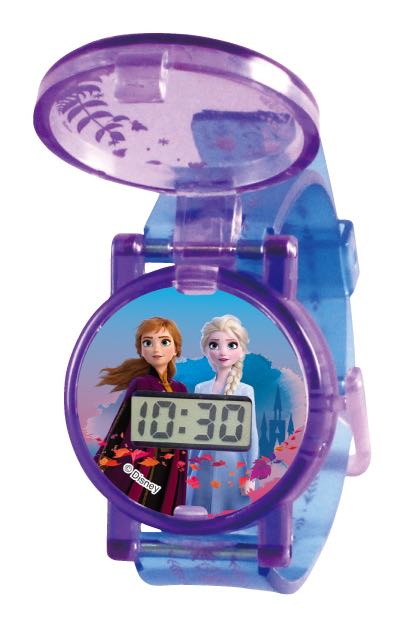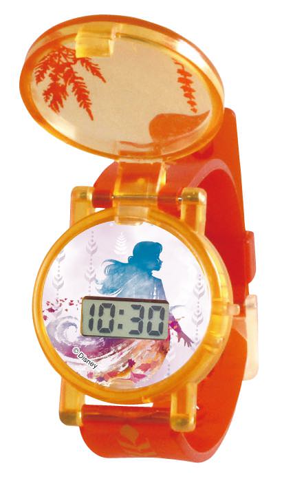 クリアパープルの蓋がアクセントになっている「アナ&エルサ」デザインの腕時計。