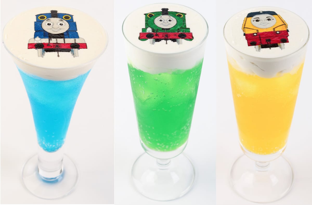 「トーマス」や「パーシー」「レベッカ」をそれぞれトップにのせた「みんなあつまれソーダ」