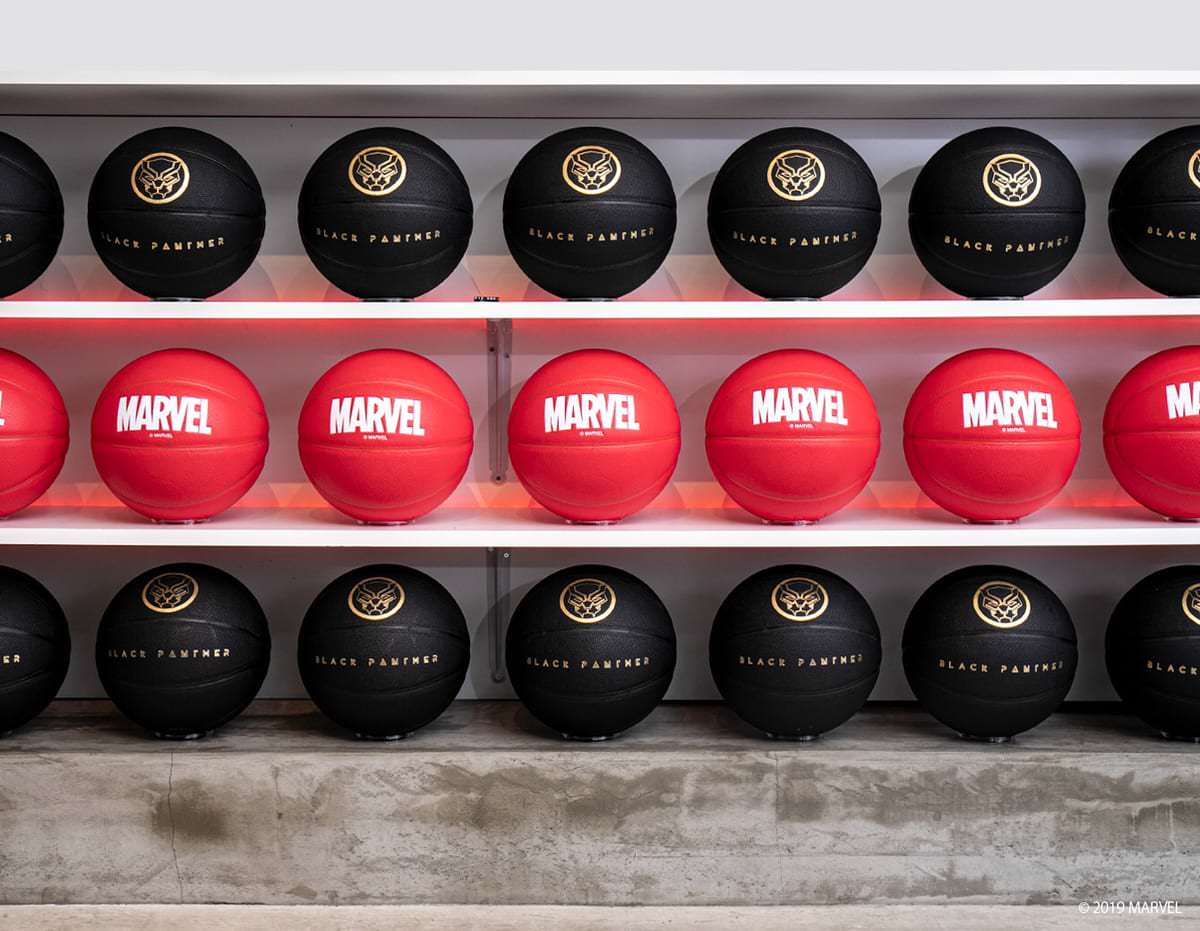 整然と並べられたバスケットボールには、「ブラックパンサー」のロゴが入ったものも。