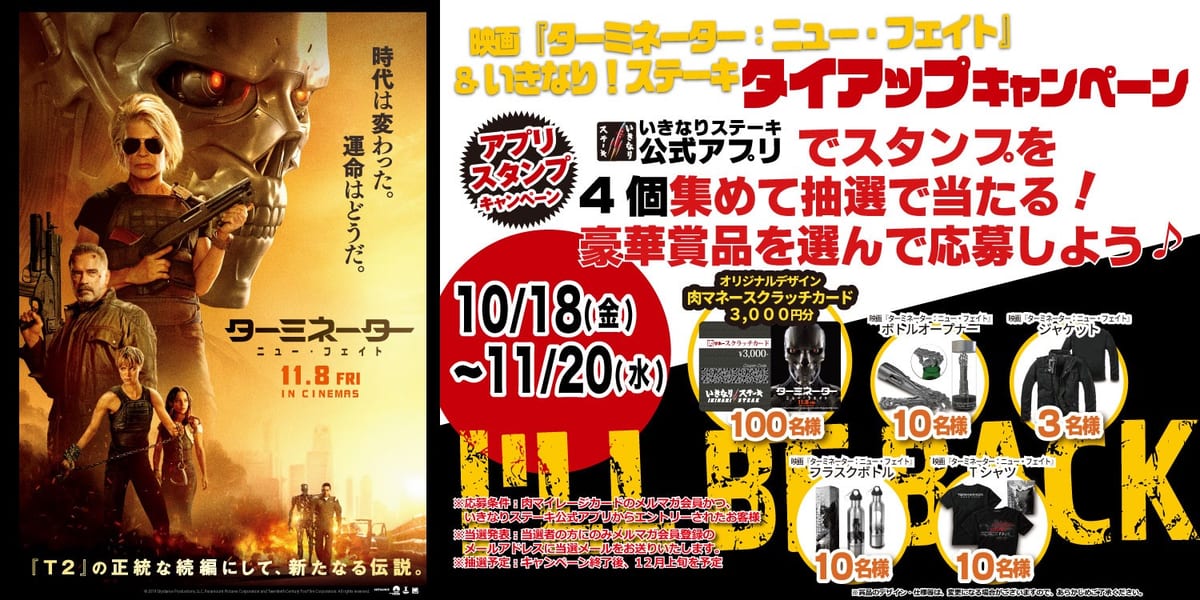 いきなり!ステーキにて、2019年11月8日(金)公開の映画『ターミネーター:ニュー・フェイト』の公開を記念したタイアップキャンペーンを期間限定で実施。