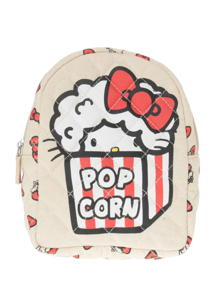 フロントのポップコーンに隠れている「ハローキティ」と、サイドとバックのリボンの総柄がキュートなデザインです。