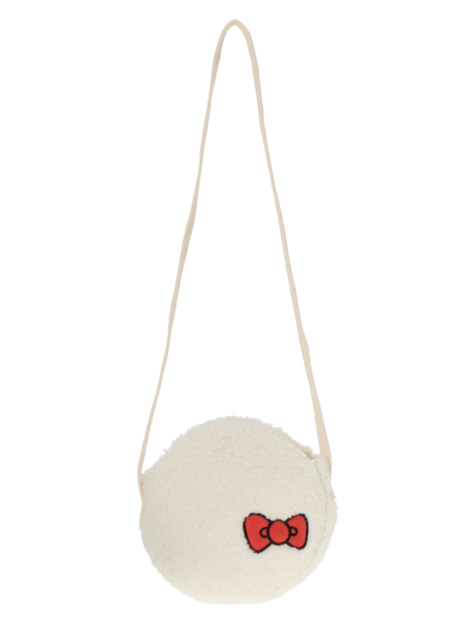 もこもこのボアにリボンのワッペンをつけたポシェットです。