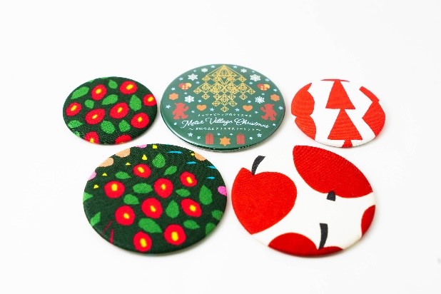 子どもから大人まで人気の缶バッジ作りに、 クリスマス期間限定のテキスタイルが加わったワークショップ。