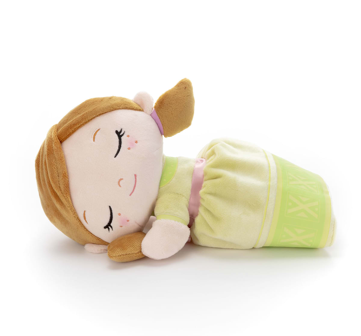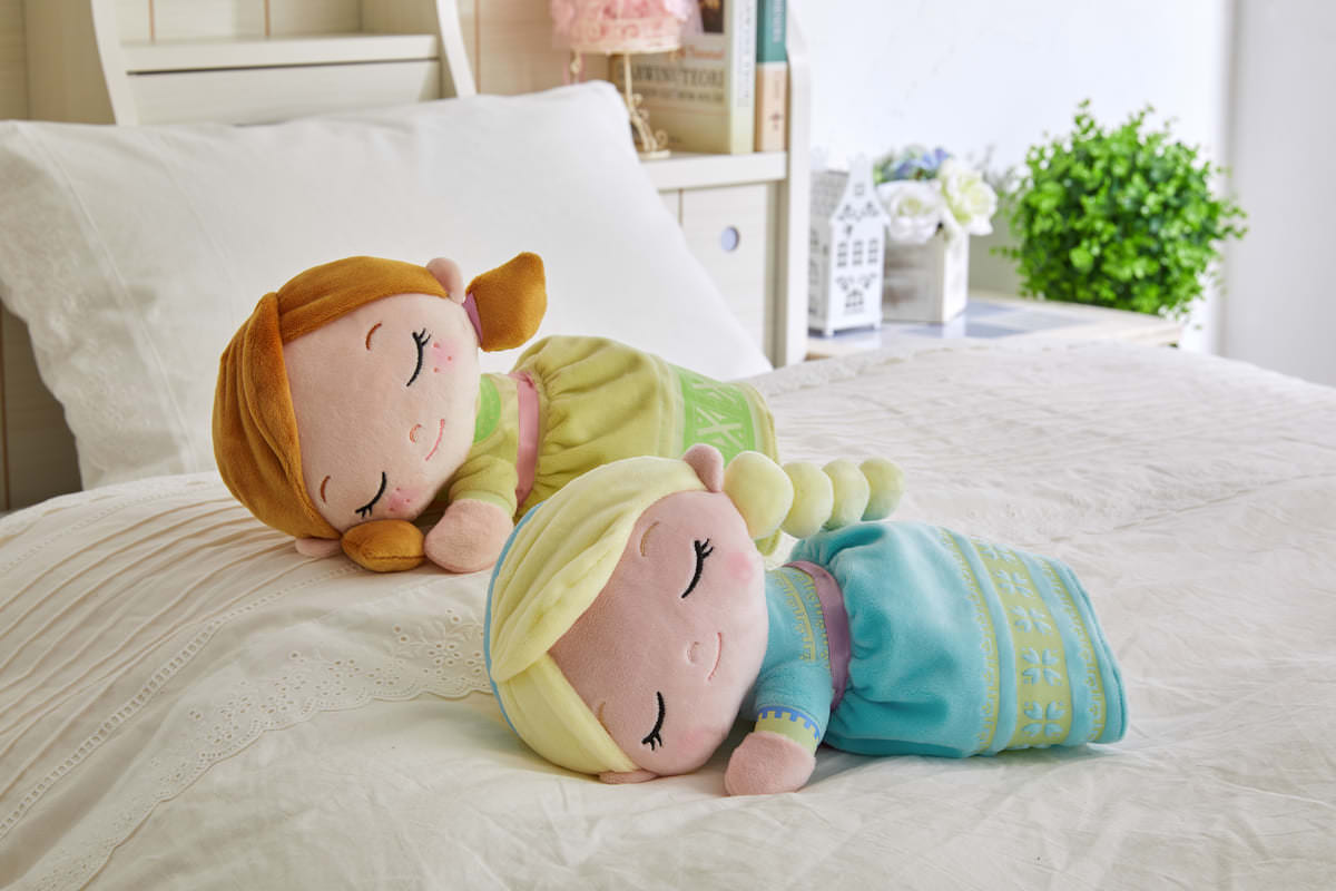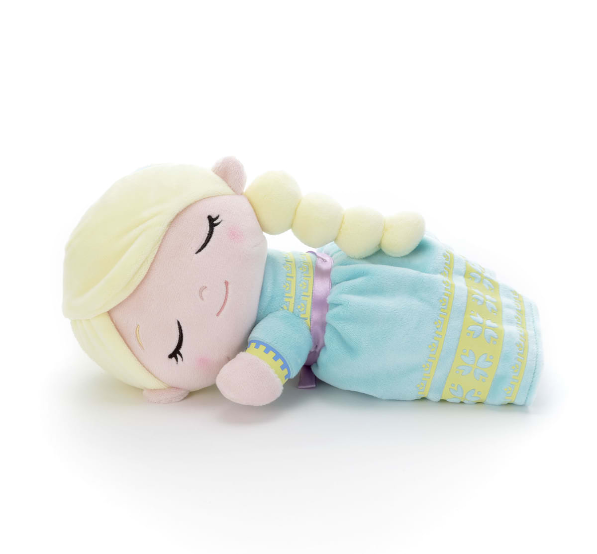 今回は、背中をなでるとメロディが流れて、暗闇でドレスが光る「アナ」と「エルサ」のぬいぐるみ「ねむねむメロディ」の紹介をします。