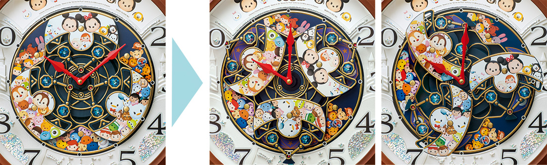 『ディズニー ツムツム』のからくり掛時計は、毎正時になると文字板のキャラクターたちが回転して華やかなパフォーマンスを繰り広げます。