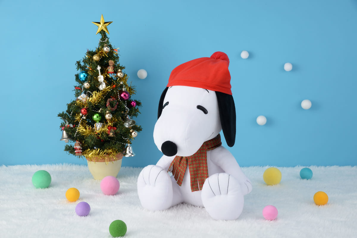 マフラーと帽子を身につけた「スヌーピー」は、41cmのビッグサイズ!