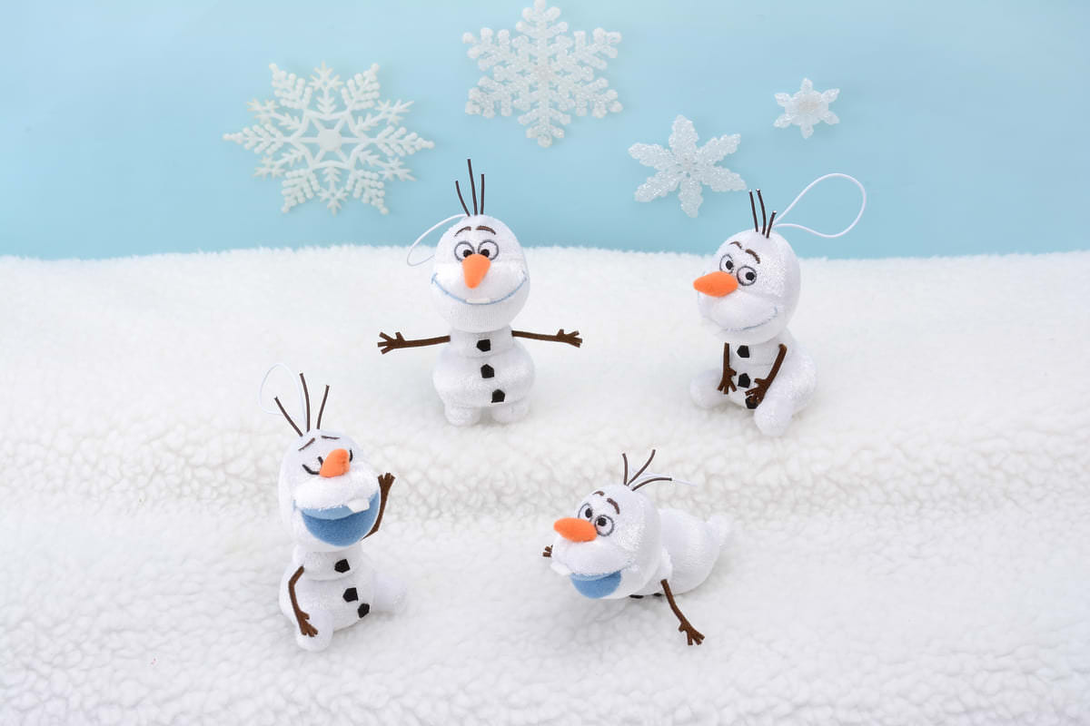 キラキラと光る光沢のある生地で制作された「オラフ」のマスコットが、全4ポーズラインナップされます。