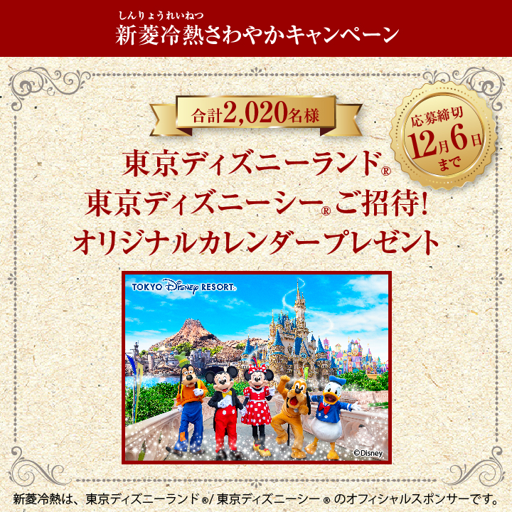 新菱冷熱工業では、2019年10月21日から2019年12月6日、10組20名様に”東京ディズニーリゾート・パークチケット(ペア)”が、2000名様に”新菱冷熱東京ディズニーリゾートオリジナル卓上カレンダー”が当たるオープンキャンペーンを開催。