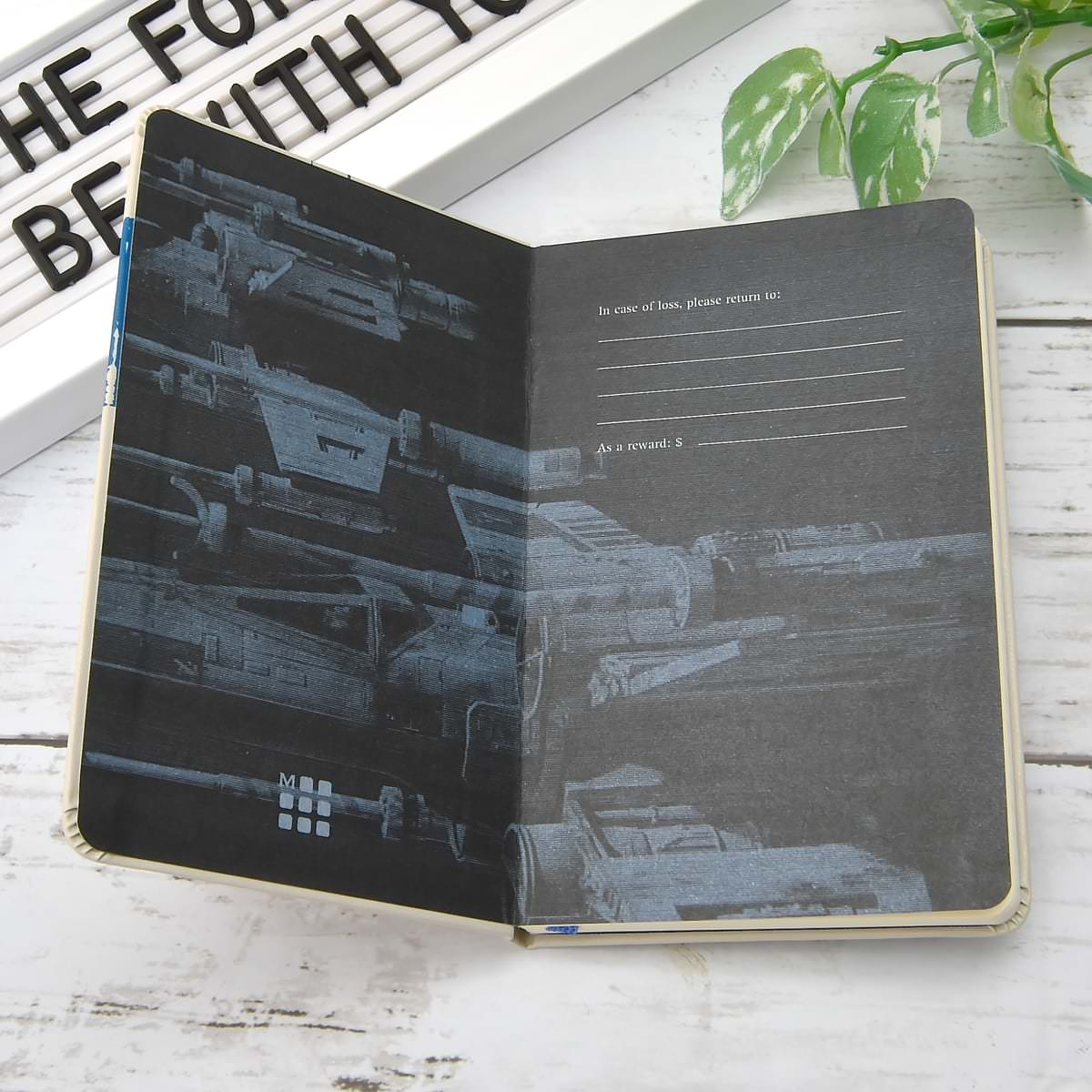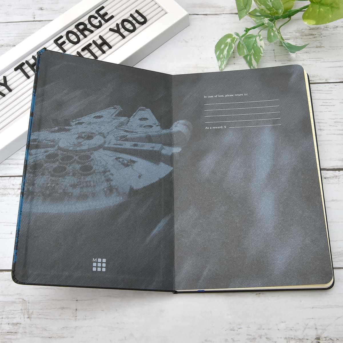 「モレスキン」の定番ともいえる表面見開きの‘In case of loss’の欄には、「ミレニアム・ファルコン」が疾走するシーンが臨場感たっぷりに落とし込まれています!
