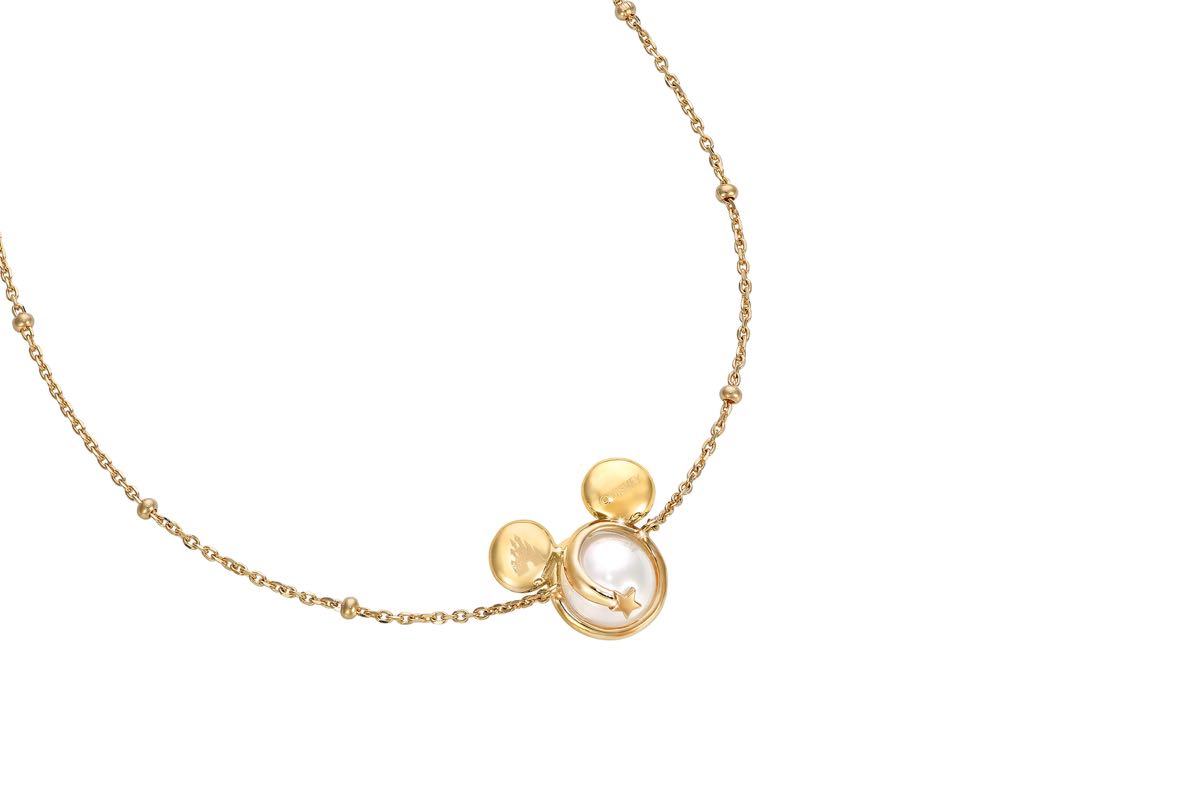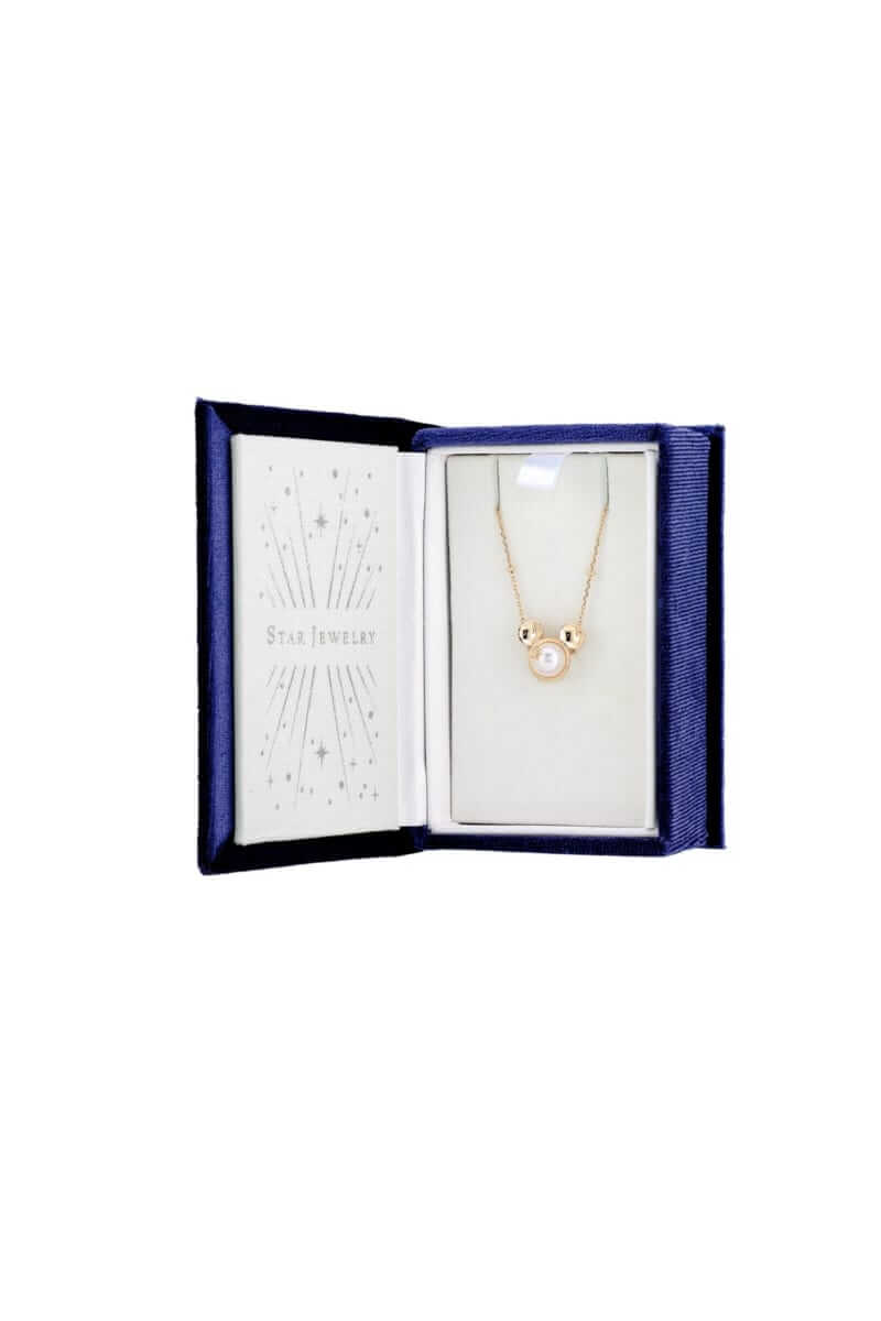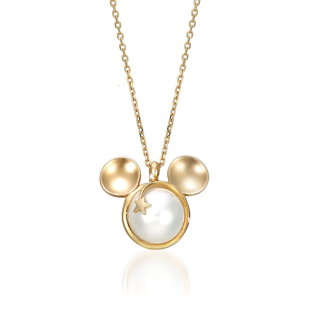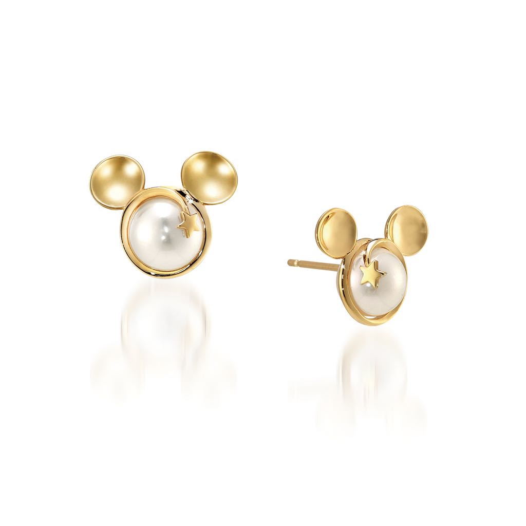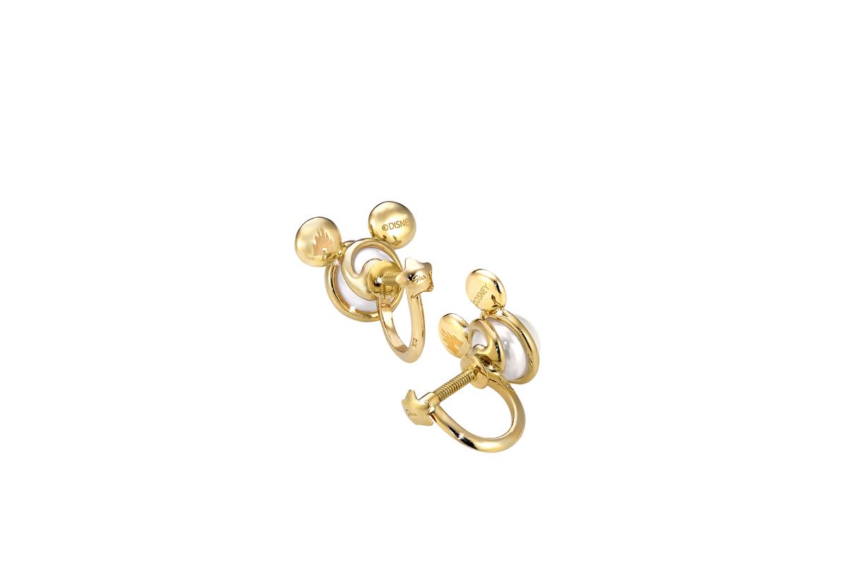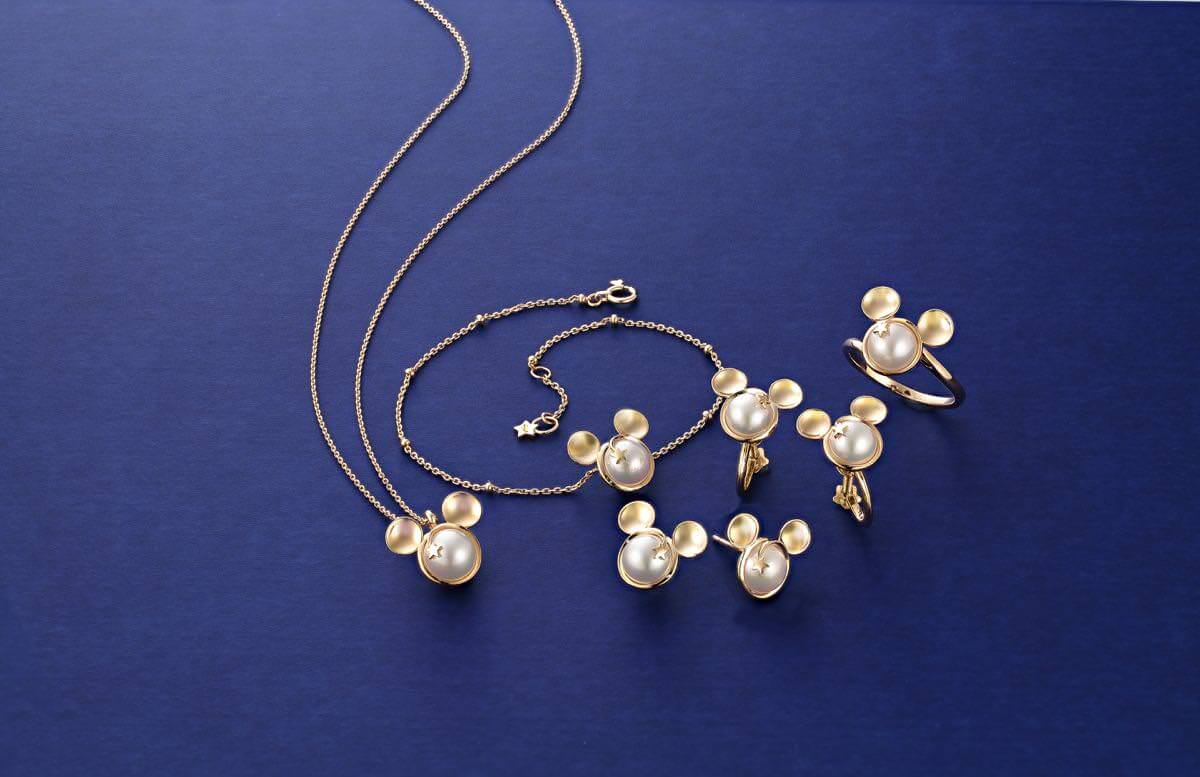 ミッキーマウスのモチーフと星のデザインがポイントのジュエリーには、アコヤパールを使用していて、可愛いらしくもエレガントなデザインになっています。