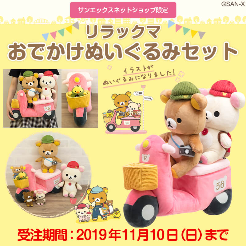 「リラックマおでかけぬいぐるみセット」は、サンエックスネットショップにて2019年10月11日(金)から11月10日(日)まで注文受付中です。