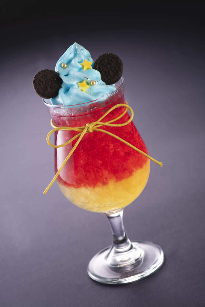 クランベリージュースとオレンジジュースで魔法使いのローブとミッキーマウスの黄色い靴を表現。