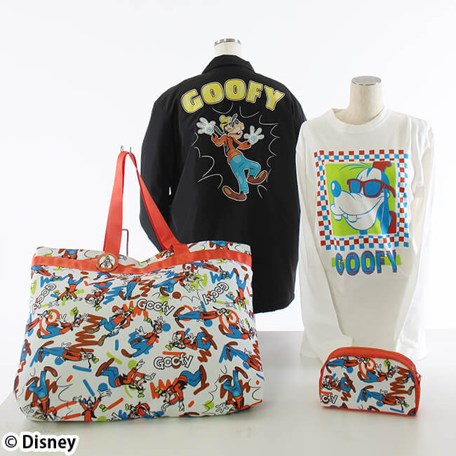 サングラスをかけたカラフルな「グーフィー」デザインのロングスリーブTシャツや、大胆なアレンジが施されたコーチジャケットなどがセットになっています。
