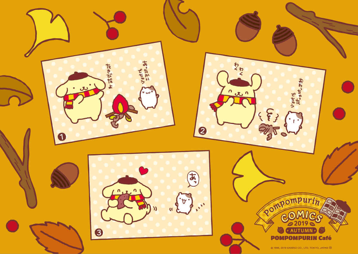 ポムポムプリン&マフィンが、なかよくもみじを見ながらお散歩しているシーンが表現されています。