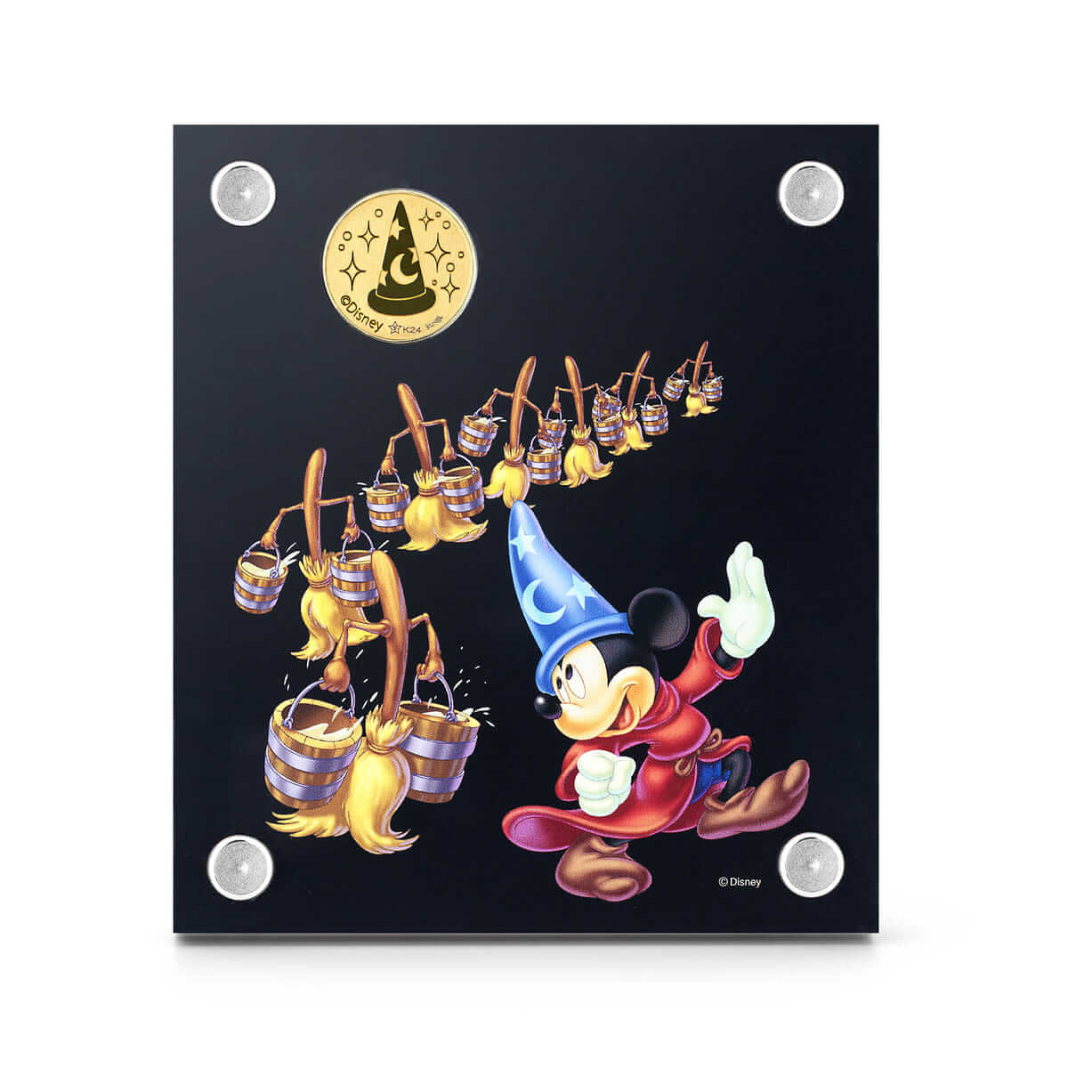 アクリルフレームの表面は、魔法使いの弟子に扮した「ミッキーマウス」がほうきに水を運ばせているところと、魔法使いが描かれたデザインのアートを使用。