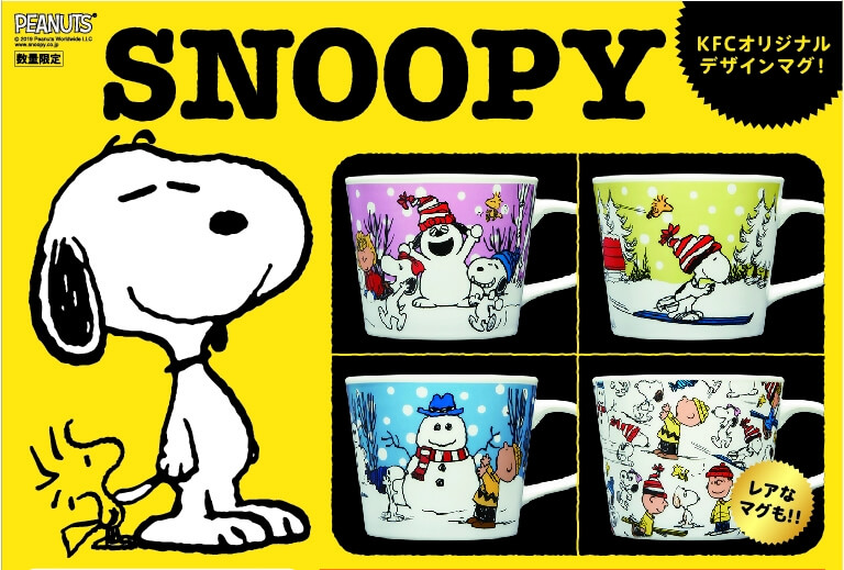 スヌーピーが登場する作品「ピーナッツ」の世界が雪に包まれた日をデザインした「スヌーピースープマグ」は、すべてケンタッキーフライドチキンオリジナルデザイン!