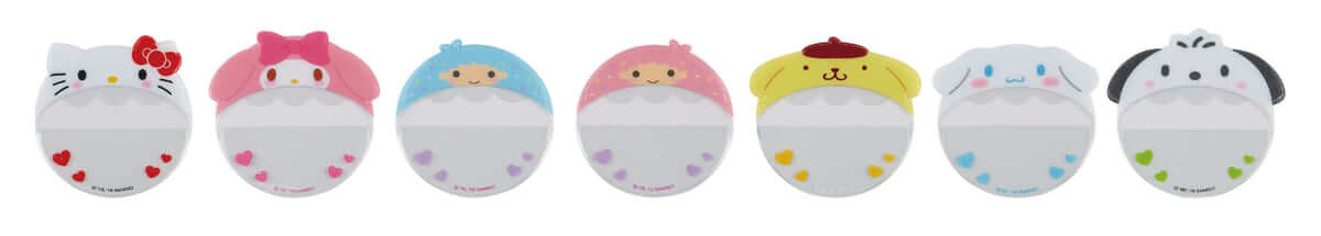 ハローキティ、マイメロディ、リトルツインスターズ(キキ、ララ)、ポムポムプリン、シナモロール、ポチャッコの6キャラクター・7アイテムが揃った缶バッジカバー。