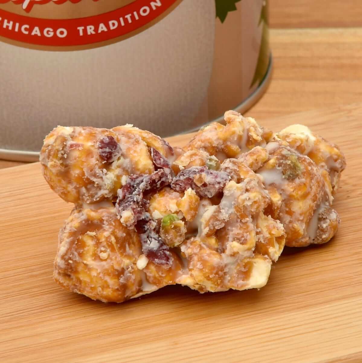 たっぷりのクラッシュド・ピスタチオをキャラメルコーティングした「ピスタチオ キャラメルクリスプ」に、雪をイメージしたホワイトチョコレートと、彩りも鮮やかなドライクランベリーを組み合わせてたポップコーン。