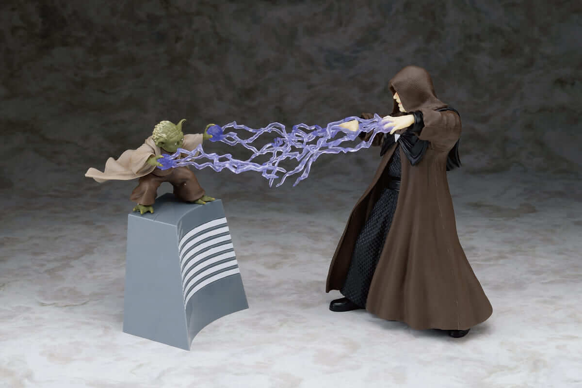 二体同時に揃えることで、伝説のジェダイマスター「ヨーダ」と、帝国軍皇帝「パルパティーン」との壮絶なフォースバトルのシーンも再現可能です!