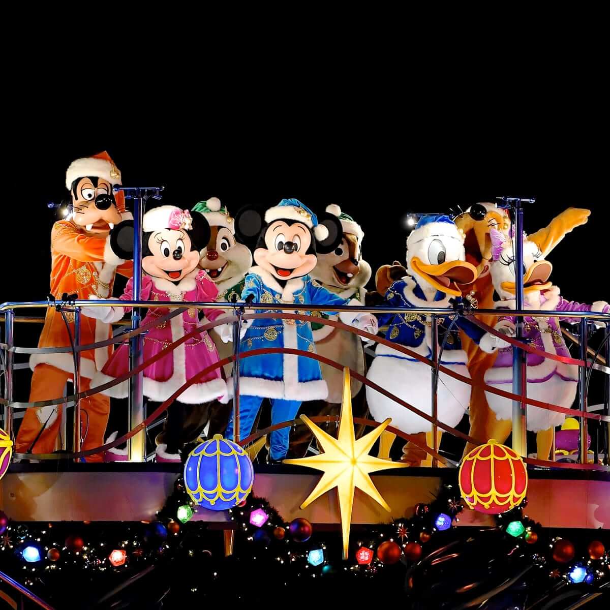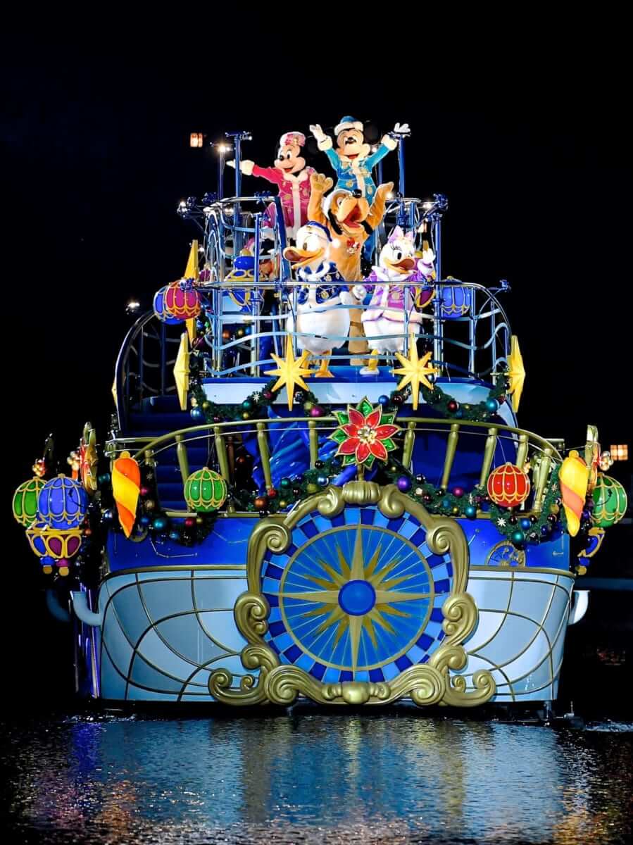 ミッキーマウスをはじめとするディズニーの仲間たちが、クリスマスのオーナメントが輝く船に乗って登場し、夜のメディテレーニアンハーバーを一層ロマンティックに彩ります。